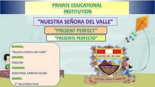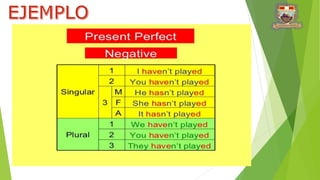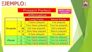 Este documento explica la estructura del tiempo presente perfecto en inglés. Describe que este tiempo verbal se usa para acciones que comenzaron en el pasado pero continúan en el presente o cuyos efectos aún perduran. Luego detalla la forma de construir oraciones afirmativas, negativas e interrogativas en presente perfecto usando los auxiliares "have" y "has" junto con el participio del verbo principal.