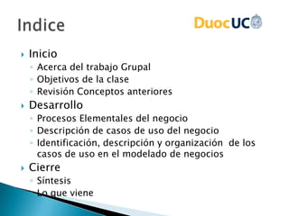 Este documento explica cómo identificar, describir y organizar casos de uso en el modelado de negocios. Se enfoca en usar procesos elementales de negocio como guía para definir casos de uso útiles para el análisis de requisitos de software. También cubre técnicas como jerarquizar casos de uso por objetivos y crearlos de forma paralela al modelado conceptual para entender mejor el dominio.