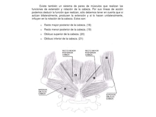 Este documento describe la columna vertebral y los ligamentos asociados. Explica que los ligamentos atlanto-occipitales y occipito-axiales unen el cráneo a las primeras vértebras cervicales, y que los ligamentos atlanto-axiales unen el atlas al axis. También describe varios ligamentos importantes como el ligamento transverso del axis y los ligamentos longitudinales anterior y posterior que recorren toda la longitud de la columna vertebral.