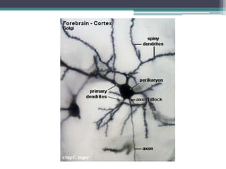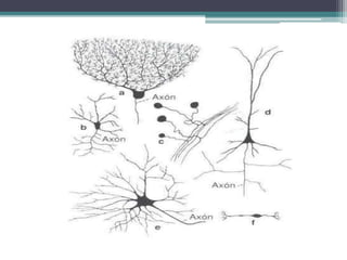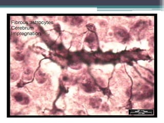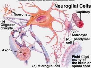Este documento describe la histología del tejido nervioso, incluyendo las neuronas, neuroglía, y sus componentes. Explica que las neuronas y la mayoría de la neuroglía tienen un origen ectodérmico y cumplen funciones sensoriales, motoras e integradoras. Describe las características de los astrocitos, oligodendrocitos, microglía y otras células gliales, y cómo apoyan y protegen a las neuronas.
