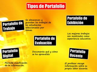 Este documento describe diferentes tipos de portafolios, incluyendo portafolios de exhibición, evaluación y para el profesorado. También discute ventajas y desventajas de los portafolios, como fomentar la autonomía del estudiante pero también requerir un cambio en el estilo de enseñanza. Finalmente, señala que la estructura de un portafolio de evaluación puede variar según la disciplina.