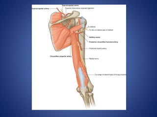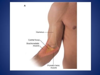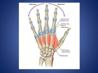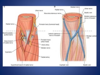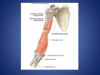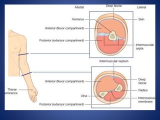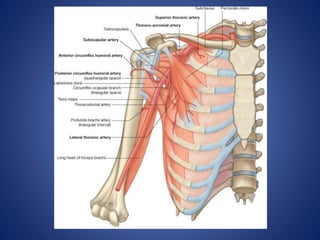 Este documento describe la miología y vascularidad de la extremidad superior. Resume los principales músculos del brazo, antebrazo y mano, así como las arterias subclavia, axilar y humeral y sus ramas colaterales. Proporciona detalles sobre los grupos musculares anterior, posterior y lateral del antebrazo, así como los músculos de la eminencia tenar y hipotenar de la mano.