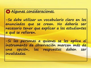 El documento contiene consideraciones sobre el uso de un vocabulario claro en los enunciados de instrumentos de observación y la invalidación de respuestas si se marca más de una opción. También expresa que los instrumentos presentados estuvieron bien explicados y que el autor no quedó conforme con el instrumento creado por su grupo.