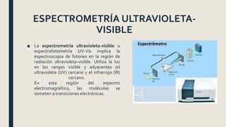 Este documento describe el uso de la espectrofotometría UV-Vis para determinar compuestos fenólicos en pimientos y ajíes. Explica que la espectrofotometría UV-Vis implica la espectroscopia de fotones en la región ultravioleta-visible, donde las moléculas experimentan transiciones electrónicas. También se utiliza para cuantificar soluciones iónicas metálicas y compuestos orgánicos conjugados midiendo la absorción de luz. El método de Folin-Ciocalteu
