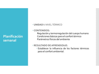 Este documento presenta información sobre el confort térmico y los factores que lo determinan. Explica que el confort térmico se refiere a un estado de equilibrio fisiológico donde no existe malestar. Luego, describe los factores que influyen en el confort térmico, tanto factores externos como internos y los parámetros para lograr el confort térmico. Finalmente, resume conceptos clave relacionados con la transmisión de calor, la inercia térmica y el aislamiento térmico.