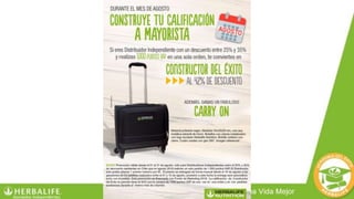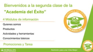 Este documento resume una presentación sobre la Academia de Éxito de Herbalife. Explica la historia de Herbalife, sus productos como el Desayuno Ideal y la Proteína Personalizada, y los pasos para convertirse en Distribuidor Independiente y lograr mayores niveles como Consultor Mayor. El objetivo es capacitar a los asociados sobre la compañía y sus oportunidades.