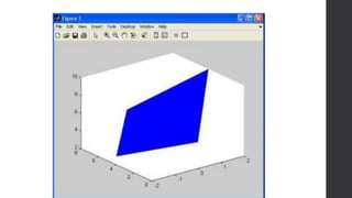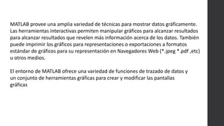 El documento describe las capacidades de MATLAB para crear gráficos. MATLAB permite crear gráficos 2D y 3D de funciones, datos y mallas. Incluye herramientas para manipular gráficos, como etiquetas, títulos y opciones de visualización. Las funciones como plot, mesh, surf crean diferentes tipos de gráficos a partir de los datos proporcionados.