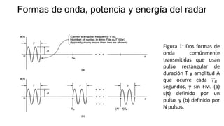 Este documento presenta los principios básicos del radar, incluyendo diferentes formas de onda, potencia y energía que puede transmitir un radar, así como efectos como el doppler y cambios en la forma de onda recibida debido al movimiento de un blanco. También explica conceptos como la medida del alcance, la ambigüedad y resolución de alcance. Finalmente, discute cómo la polarización de las ondas electromagnéticas reflejadas puede proporcionar información sobre la geometría y naturaleza de un blanco.
