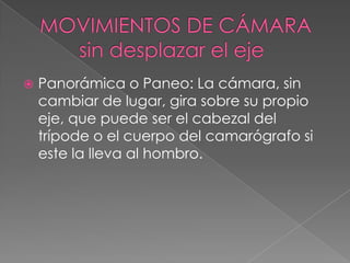Este documento describe los diferentes tipos de movimientos de cámara, incluyendo cámara fija, paneo, zoom óptico, travelling, y formas de uso como cámara en mano, steady cam y dolly. Explica que el paneo implica girar la cámara sobre su eje sin moverla de lugar, mientras que el travelling desplaza la cámara en cualquier dirección. También diferencia el zoom óptico, que mueve las lentes, del zoom digital.