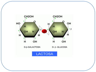 Los carbohidratos son la biomolécula más abundante, compuestos por carbonos, hidrógenos y oxígenos, y su unidad básica son los monosacáridos, que son esenciales para la producción de energía en organismos. Los disacáridos y polisacáridos, como el almidón y la celulosa, cumplen funciones energéticas y estructurales, siendo el almidón la principal reserva de energía en plantas y el glucógeno en animales. En el cuerpo humano, los carbohidratos son la primera fuente energética, proporcionando 4 calorías por gramo y siendo absorbidos en un 98% por el sistema digestivo.