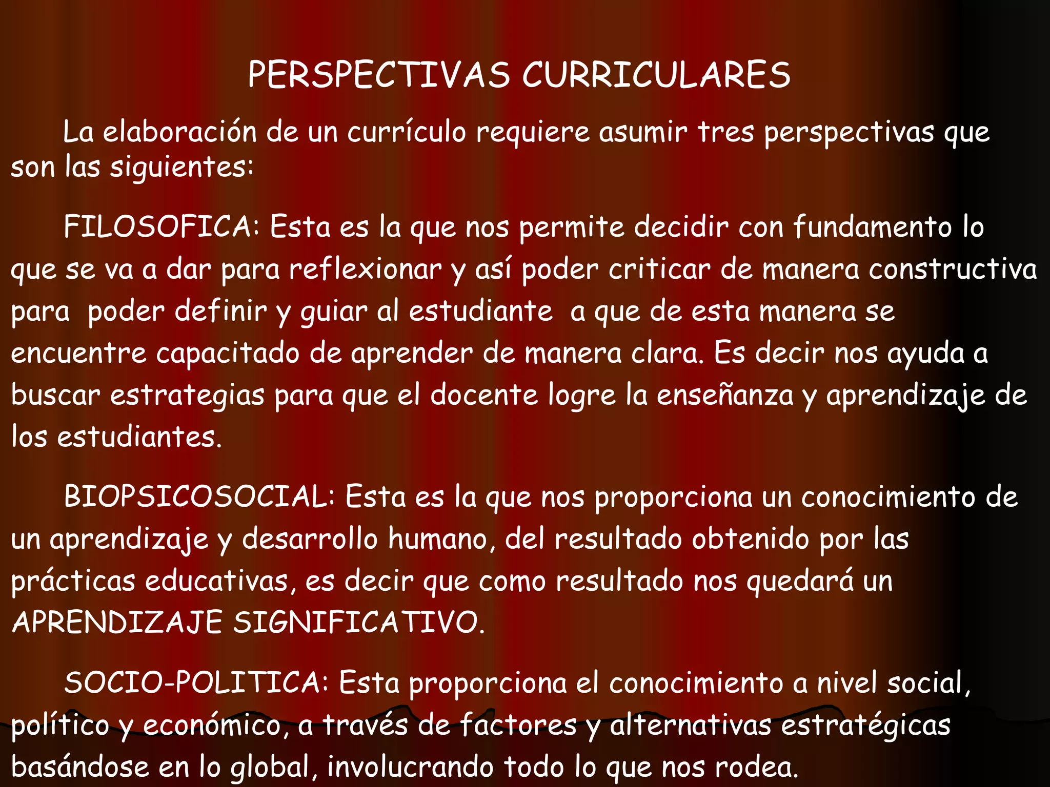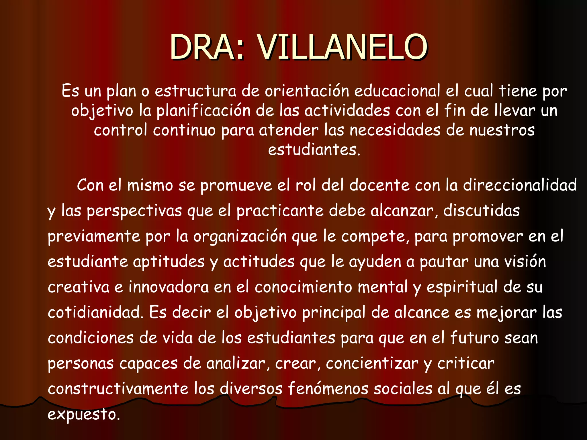El documento describe el plan educativo DRA: VILLANELO, cuyo objetivo es planificar actividades para controlar las necesidades de los estudiantes y promover habilidades creativas. Explica que se debe mejorar las condiciones de vida de los estudiantes para que sean personas capaces de analizar y criticar constructivamente los fenómenos sociales. También describe tres perspectivas curriculares: filosófica, biopsicosocial y socio-política. Finalmente, clasifica el currículo como un instrumento para la reproducción social e ideológica que forma
