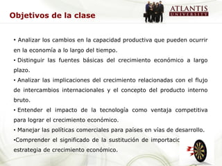 Este documento presenta los objetivos y estrategias de una clase sobre políticas comerciales y crecimiento. Los objetivos incluyen analizar los cambios en la capacidad productiva a lo largo del tiempo, distinguir las fuentes básicas del crecimiento económico a largo plazo, y comprender el impacto de las políticas comerciales en países en desarrollo. Las estrategias instructivas incluyen investigar sobre temas como el crecimiento comercial y las políticas de sustitución de importaciones. La evaluación consistirá en un foro de discusión