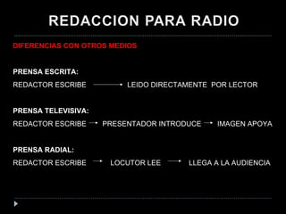 El documento proporciona recomendaciones para la redacción de noticias para la radio, incluyendo usar oraciones cortas y simples, evitar adverbios y abreviaturas, usar un lenguaje claro y concreto, y proporcionar contexto para lugares y personas desconocidos. También recomienda escribir en mayúsculas, usar números en letras, y revisar el texto en voz alta para asegurar una buena pronunciación y fluidez.