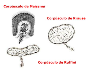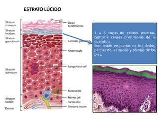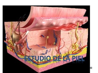 El documento describe la estructura y función de la piel y sus componentes. La piel está compuesta por la epidermis, la capa más externa formada por queratinocitos, melanocitos y células de Langerhans. Debajo se encuentra la dermis, que contiene folículos pilosos, glándulas, nervios y vasos sanguíneos. La piel contiene diferentes tipos de receptores sensoriales y glándulas como las sudoríparas y sebáceas. Las quemaduras se clasifican en primer, segundo y tercer grado
