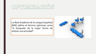 El documento habla sobre los métodos de optimización. Define optimizar como buscar la mejor forma de realizar una actividad. Explica que los métodos de optimización se clasifican en métodos clásicos y metaheurísticos, donde los primeros buscan un óptimo local garantizado y los metaheurísticos imitan fenómenos naturales para obtener un óptimo global aunque no se garantiza.