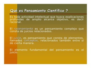 El documento habla sobre la ciencia, la teoría científica y el método científico. Explica que la ciencia es un sistema de conocimientos demostrados que proceden de acuerdo a un método y que se utiliza para describir y explicar fenómenos observados. Señala que una teoría científica es un cuerpo lógico de hipótesis, conceptos y observaciones que se sustentan en evidencia y ayudan a formular nuevos experimentos. Finalmente, destaca que la ciencia tiene como objetivo ir más allá de las observ