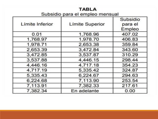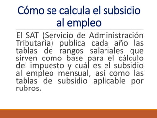 Este documento explica el cálculo del impuesto sobre la renta (ISR) para personas físicas con ingresos por salarios en México. Detalla cómo calcular el ISR retenido y el subsidio al empleo usando tablas de rangos salariales publicadas anualmente. También cubre conceptos como primas vacacionales, aguinaldo, séptimo día y días festivos laborados, y sus respectivas exenciones fiscales.