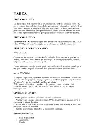 Este documento define TICs (Tecnologías de la Información y Comunicación) y NTICs (Nuevas Tecnologías de la Información y Comunicación), describe sus diferencias y ventajas. Explica que las TICs incluyen tecnologías para almacenar, enviar y procesar información, mientras que las NTICs se refieren a software, hardware e Internet. También discute cómo las TICs pueden promover la educación inclusiva al eliminar barreras y crear entornos accesibles.