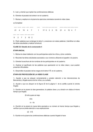 Este documento presenta las etapas y actividades de cuatro clases (32, 33, 34 y 35) sobre el aprendizaje y consolidación de las consonantes h, ñ, ch. Cada clase contiene tres etapas (inicial, proyección del video, intercambio) y varias actividades como motivación, recuerdo de letras, escritura de nombres, explicación del video, ejercicios y dictado. El objetivo es que los participantes aprendan a leer y escribir correctamente mediante el estudio y práctica de nuevas letras