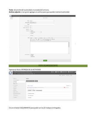 Este documento proporciona instrucciones para crear un espacio en línea para que los estudiantes presenten tareas y reciban comentarios de los profesores. Explica los pasos para configurar vistas para administradores, profesores y estudiantes, y cómo los profesores pueden revisar las tareas enviadas, agregar calificaciones y comentarios, y los estudiantes pueden ver la retroalimentación. También recomienda los formatos de archivo apropiados debido al límite de almacenamiento.