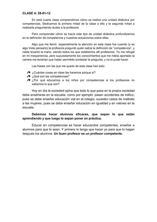 La clase se centró en comprender cómo crear una unidad didáctica basada en competencias. Los estudiantes aprendieron sobre la definición de competencia y cómo aplicarlas, aunque ninguno pudo definirla cuando se les preguntó. La clase enfatizó la importancia de educar a los estudiantes en competencias para que sean eficaces y capaces de aplicar lo que aprenden en la práctica.