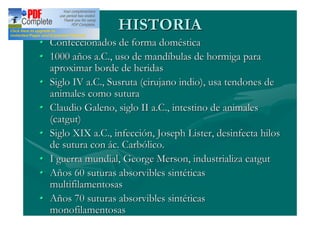 Este documento trata sobre los materiales de sutura utilizados en cirugía. Brevemente resume la historia del desarrollo de suturas, desde el uso de mandíbulas de hormigas hace 1000 años a.C. hasta el desarrollo de suturas sintéticas absorbibles en los años 1960 y 1970. Luego describe los factores a considerar al seleccionar una sutura, como sus características, el tejido a suturar y la situación del tejido. Finalmente clasifica las suturas según si son absorbibles o no absorbibles,