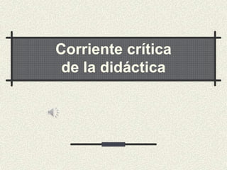 La corriente crítica de la didáctica se basa en la Escuela de Frankfurt y busca generar un espacio de reflexión crítica sobre los procesos de enseñanza-aprendizaje. Se opone a la corriente técnica que prioriza el interés práctico sobre el emancipador. La didáctica estudia las teorías de la enseñanza y cómo se aplican en contextos socio-históricos. La nueva agenda se enfoca en el pensamiento del profesor y cómo fomentar procesos reflexivos en los estudiantes a través