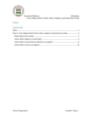 Este documento proporciona instrucciones para insertar diferentes tipos de contenido multimedia en un blog, incluyendo videos de YouTube mediante códigos embed, imágenes desde varias fuentes, presentaciones de SlideShare mediante códigos embed, y prezis de Prezi mediante códigos embed.