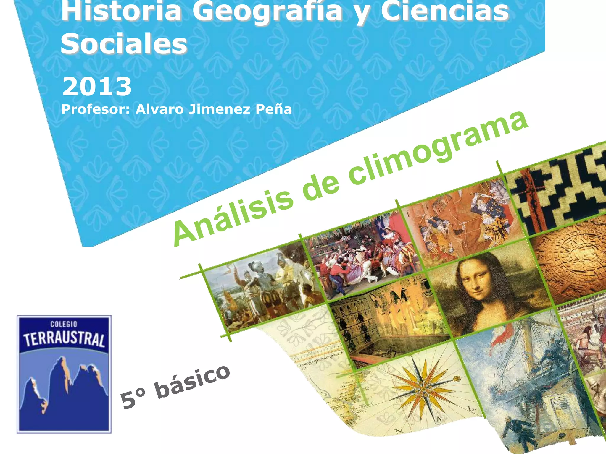 El documento explica qué es un climograma y cómo se usa para representar la distribución de las temperaturas y precipitaciones en una zona durante el año. Incluye climogramas de diferentes regiones de Chile como Arica, La Serena, Santiago, Concepción y Balmaceda. También incluye actividades para identificar el mes más cálido, lluvioso, frío y seco de un climograma y calcular el promedio anual de precipitaciones.