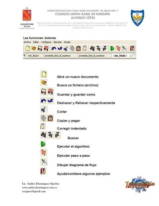 Este documento presenta una introducción al software PSeInt, una herramienta educativa para la enseñanza de la programación. Explica que PSeInt utiliza un pseudolénguaje en español y editores de diagramas de flujo para ayudar a los estudiantes a concentrarse en los conceptos básicos de la programación. Además, incluye dos ejemplos de algoritmos sencillos: uno para saludar ingresando un nombre y otro para sumar dos números.