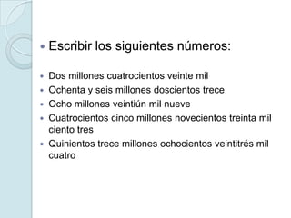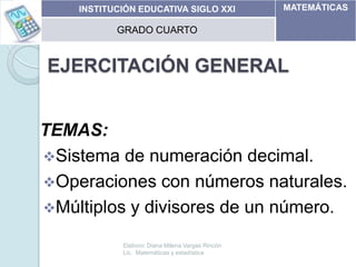 Este documento presenta un conjunto de ejercicios de matemáticas sobre sistemas de numeración decimal, operaciones con números naturales, múltiplos y divisores. Los ejercicios incluyen descomponer números, escribir números en palabras, realizar operaciones como suma y multiplicación, identificar múltiplos y divisores, y resolver problemas que implican estas habilidades matemáticas fundamentales.