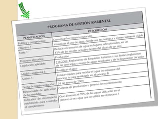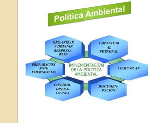 Este documento habla sobre la gestión ambiental. Explica que la gestión ambiental es el marco que usan las organizaciones para planificar, lograr y mantener un funcionamiento de acuerdo con las metas ambientales establecidas. También describe los componentes clave de un sistema de gestión ambiental, incluyendo la política ambiental, planificación, implementación, verificación y mejora continua. El objetivo final es ayudar a las organizaciones a cumplir con los requisitos ambientales y mejorar su desempeño ambiental de manera sistemática.