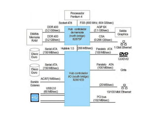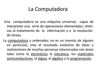 Este documento describe las principales características de una computadora. Explica que una computadora es una máquina capaz de interpretar operaciones elementales para procesar información y resolver tareas, y que su desarrollo es el resultado de ideas y realizaciones de muchas personas de diferentes áreas como electrónica y programación. También describe brevemente los componentes principales de una computadora como la memoria RAM, el microprocesador y la placa base o motherboard.