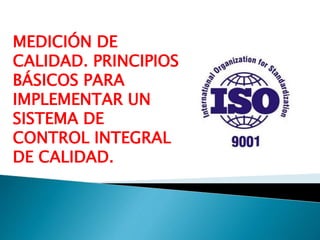 Este documento describe los principios básicos para implementar un sistema de control integral de calidad en un laboratorio, incluyendo estructura organizacional, planificación, recursos, procesos y procedimientos. Explica las funciones clave del control de calidad como pruebas, monitoreo, auditoría y reportes. Finalmente, destaca las ventajas de este sistema como prevenir productos peligrosos y garantizar la eficacia y cumplimiento legal de los productos.