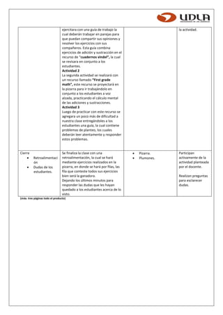 Este documento presenta el plan de clase para una lección de matemáticas de primer grado sobre adición y sustracción. La lección utilizará varios recursos digitales e incluirá tres actividades. Primero, los estudiantes activarán sus conocimientos previos usando un recurso digital. Luego, repasarán los conceptos a través de una presentación en PowerPoint y realizarán ejercicios en grupos. Más adelante, practicarán cálculos mentales usando otro recurso proyectado. Finalmente, resolverán problemas matemáticos. La cl