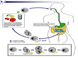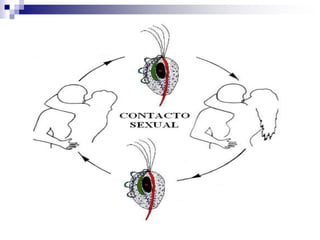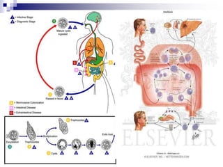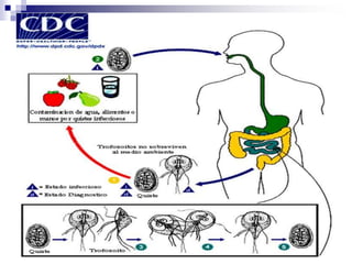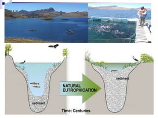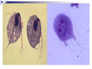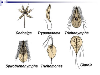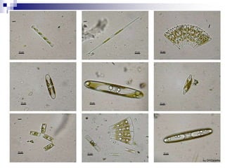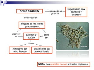 El documento describe el reino Protista, que incluye organismos unicelulares eucariotas como protozoos y algas. Los protozoos son heterótrofos microscópicos que se mueven usando cilios, flagelos o pseudópodos, y pueden ser de vida libre o parásitos. Las algas incluyen clorofitas, feofitas y rodofitas que realizan fotosíntesis y se clasifican por sus pigmentos. Algunas algas son útiles y otras pueden causar problemas como eutrofización.