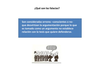 El documento habla sobre las falacias en la argumentación. Explica que las falacias son errores que desvirtúan un argumento al no establecer una relación válida con la tesis que se defiende. Describe varios tipos de falacias como las emocionales, las de generalización apresurada y las que apelan a la ignorancia o amenazas. Finalmente, menciona que detectar falacias permite rebatir argumentos de forma más sólida exigiendo que sean creíbles, tengan relación con la tesis y sean suficient