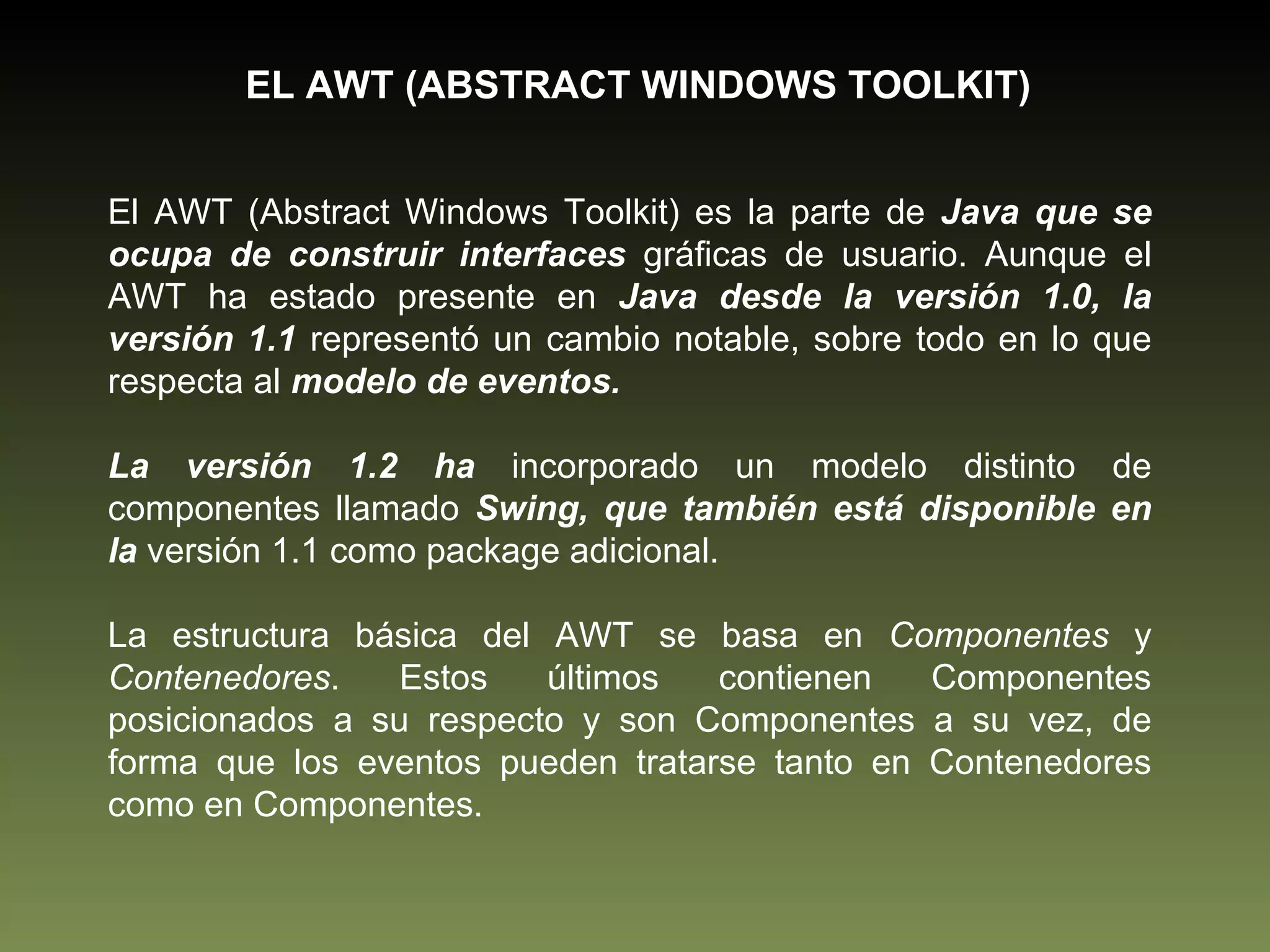 El documento habla sobre el AWT (Abstract Windows Toolkit) y Swing en Java. El AWT permite construir interfaces gráficas de usuario mediante componentes y contenedores. Swing es una biblioteca que reemplaza algunos componentes AWT y ofrece layout managers. El documento también explica el modelo de eventos en Java y los diferentes tipos de eventos como acciones del ratón y teclado.