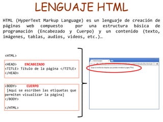El documento proporciona una introducción al lenguaje HTML y cómo crear y mejorar páginas web. Explica las etiquetas básicas de HTML como <HTML>, <HEAD>, <BODY>, <TITLE>, <P>, <H1>-<H6>, <CENTER>, y <HR> y cómo se usan para estructurar una página web. También cubre etiquetas adicionales como <BR>, <B>, <I>, <U>, <BLOCKQUOTE>, <OL>, <UL>, <A HREF>, <BGCOLOR>, <BACKGROUND>, <LINK>, <VLINK>, <ALINK>