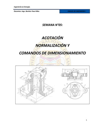Este documento proporciona información sobre la acotación en ingeniería, incluyendo definiciones de elementos de la cota, principios generales de acotación, clasificación de cotas, líneas de cota, líneas auxiliares de cota, líneas de referencia y extremos de líneas de cota. El objetivo principal de la acotación es indicar de forma clara las dimensiones del objeto representado en el dibujo de ingeniería.