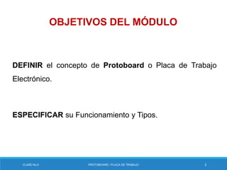 Este documento describe el protoboard o placa de trabajo, que es una placa que permite conectar componentes electrónicos para construir circuitos. Explica que el protoboard tiene orificios internamente conectados en filas y columnas para interconectar los componentes. Además, menciona que existen protoboards de tres tamaños diferentes - grande, mediana y chica - dependiendo de la cantidad de puntos de conexión.