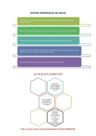 Este documento describe las propiedades y efectos del cloroformo y las cetonas. El cloroformo es un líquido incoloro y volátil que puede causar la muerte con solo 10 ml si se ingiere. Las cetonas son disolventes industriales que también pueden causar intoxicación por inhalación, ingestión o contacto dérmico. Ambas sustancias deben almacenarse lejos de la luz y pueden descomponerse lentamente en productos tóxicos. La exposición crónica puede dañar múltiples órganos
