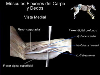 Este documento describe la miología del miembro torácico canino. Explica los músculos extrínsecos e intrínsecos del miembro torácico, incluyendo sus orígenes, inserciones y funciones. También describe los principales grupos musculares de la articulación del hombro, el codo y el antebrazo. En total, identifica y explica más de 20 músculos individuales del miembro torácico canino.