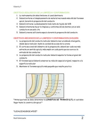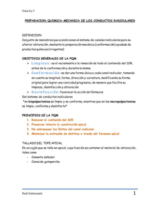 1. El documento describe los pasos de la preparación química-mecánica de los conductos radiculares, incluyendo la limpieza, conformación y desinfección de los conductos.