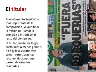 Este documento describe los diferentes elementos que componen una página impresa, incluyendo el titular, cuerpo de texto, pie de foto, slogan, flash, subtítulos, fotografías, espacios en blanco, y elementos decorativos. Explica que cada elemento tiene un propósito y debe diseñarse cuidadosamente para transmitir efectivamente el mensaje y atraer la atención del lector.