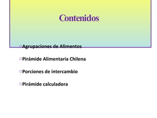 El documento describe la historia y fundamentos de la Pirámide Alimentaria Chilena. Explica que se creó en 1996 para abordar problemas de nutrición relacionados con el déficit y exceso de ingesta. Describe cada uno de los cinco grupos de alimentos que componen la pirámide y sus características nutricionales. El objetivo es promover una alimentación equilibrada, variada y de acuerdo a las recomendaciones nutricionales chilenas.