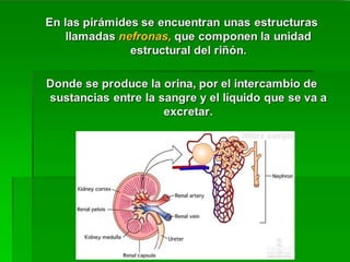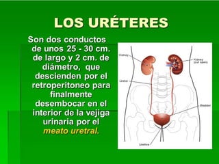 El riñón es un órgano ovoide, de aproximadamente 140 gramos en hombres y 125 gramos en mujeres, situado en las fosas lumbares, con importantes relaciones anatómicas con estructuras adyacentes. Está compuesto por una cápsula fibrosa, parénquima renal (corteza y médula), y su función incluye filtración, reabsorción, secreción y concentración de orina. Además, las glándulas suprarrenales, que se encuentran sobre cada riñón, son frágiles y están compostas por diversas capas de tejido.