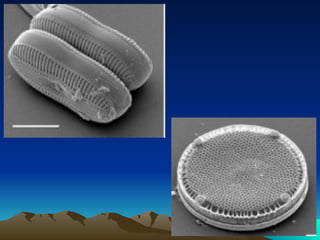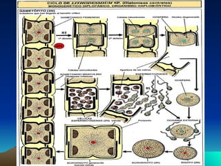 La división Bacillariophyta incluye organismos unicelulares conocidos como diatomeas. Poseen una pared celular silicificada llamada frústula, que puede tomar diferentes formas y presentar diversas ornamentaciones. Se reproducen de forma vegetativa y también sexualmente, formando cigotos. Algunas especies son móviles gracias a la presencia de un surco llamado rafe, mientras que otras son radialmente simétricas y carecen de él.