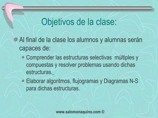 Este documento presenta los objetivos y contenidos de una clase sobre decisiones compuestas y múltiples en lógica computacional. Explica las estructuras selectivas compuestas donde una decisión anida a otra, y da un ejemplo de cómo calcular el pago de horas extras de un trabajador. También cubre las estructuras selectivas múltiples donde hay más de dos opciones posibles, representadas mediante un selector que elige una de varias acciones. Finalmente agradece a los estudiantes por asistir a la clase.
