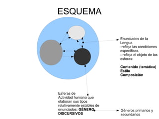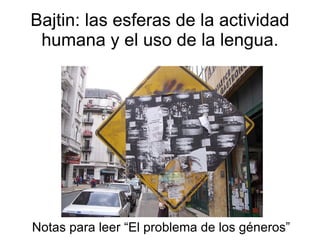 El documento habla sobre las esferas de actividad humana y los géneros discursivos según Bajtin. Existen esferas como la ciencia, la política y la literatura, cada una con sus propios géneros como artículos científicos, editoriales o novelas. Los géneros reflejan las características de la esfera a la que pertenecen en términos de contenido, estilo y composición. El estudio de los géneros es complejo debido a la riqueza y diversidad que surge de las múltiples